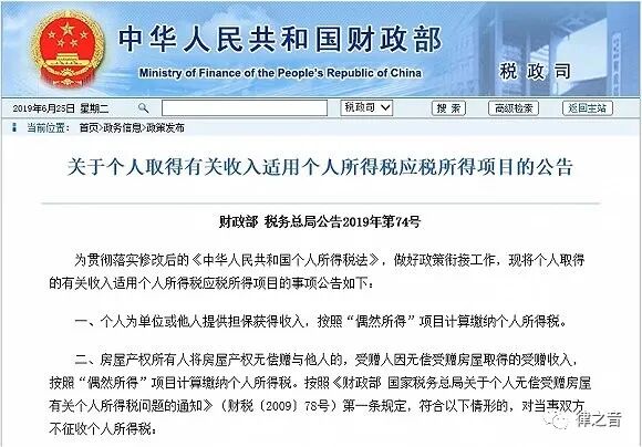 房屋产权所有人将房屋产权无偿赠与配偶、父母、子女、祖父母、外祖父母、孙子女、外孙子女、兄弟姐妹等情形不征收个税。今年6月25日财政部、税务总局联合印发《关于个人取得有关收入适用个人所得税应税所得项目的公告》(财政部税务总局公告2019年第74号,以下简称《公告》)。